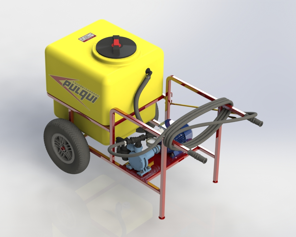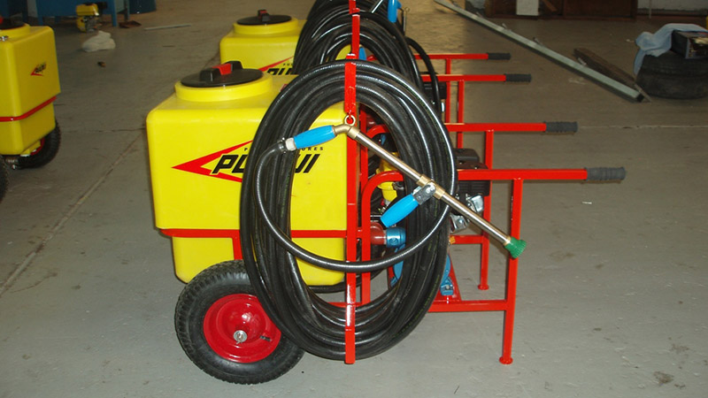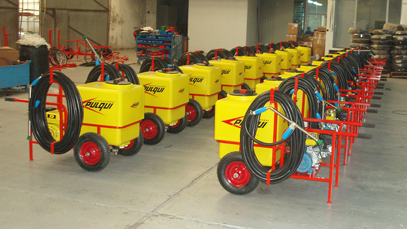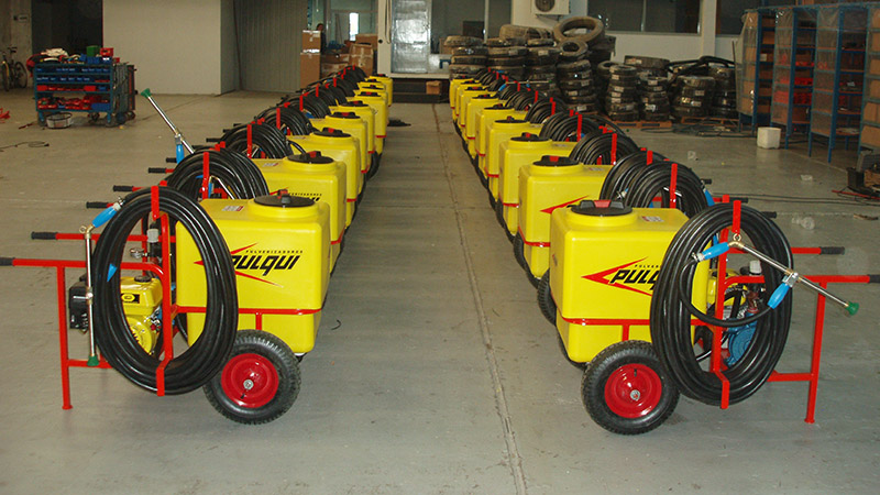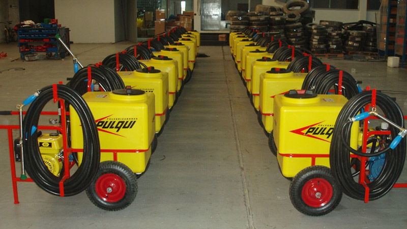 Equipo pulverizador portátil, fácilmente transportable, de sencillo manejo y gran versatilidad de uso, imprescindible en movimientos de cereales, ideal para pulverizar en plantas de silos, celdas, desinfección de galpones, establecimientos avícolas, baños de hacienda, etc. Tanque: de fibra de vidrio de alta resistencia, capacidad 160 lts., tapa a rosca. Filtro aspiración con válvula de aislamiento. Válvula reguladora de presión. Manómetro en baño de glicerina. Lanza de aspersión de caudal regulable con 5 metros de manguera. Bomba centrífuga, accionada por motor a explosión o eléctrico.